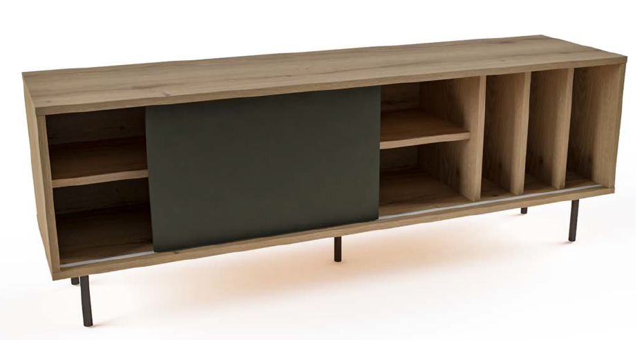 Έπιπλο τηλεόρασης 18mm, με μεταλλικά πόδια, συρόμενη πόρτα και κάθετοι χώροι για βιβλία ή δίσκους βινυλίου (YxB: 35.8 * 33.6 cm). Διατίθεται σε 4 natural χρώματα και δυνατότητα συνδυασμού με ανθρακί πορτάκι.