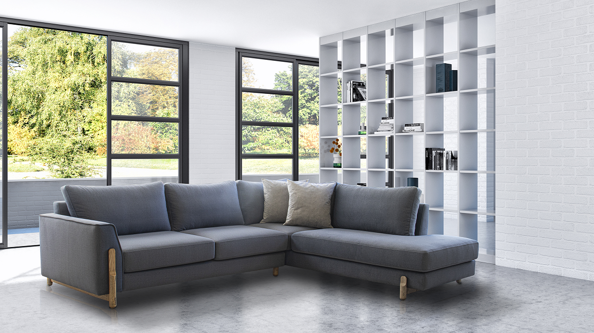Γωνιακός καναπές με λαξευτά ξύλινα μασίφ πόδια.